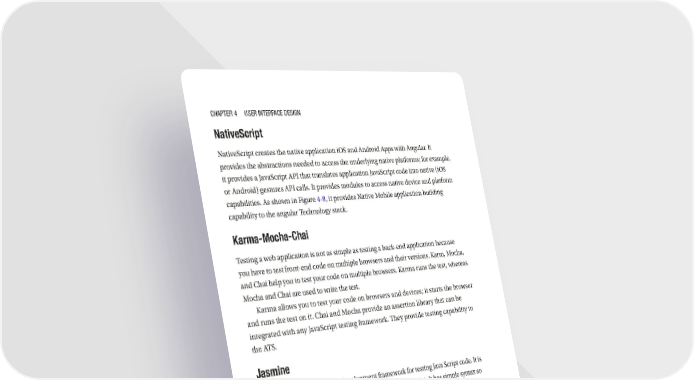 Chapter 4 User InterfaCe DesIgn NativeScript NativeScript creates the native application iOS and Android Apps with Angular. It provides the abstractions needed to access the underlying native platforms; for example, it provides a JavaScript API that translates application JavaScript code into native (iOS or Android) gestures API calls. It provides modules to access native device and platform capabilities. As shown in Figure 4-9, it provides Native Mobile application building capability to the angular Technology stack. Karma-Mocha-Chai Testing a web application is not as simple as testing a back-end application because you have to test front-end code on multiple browsers and their versions. Karm, Mocha, and Chai help you to test your code on multiple browsers. Karma runs the test, whereas Mocha and Chai are used to write the test. Karma allows you to test your code on browsers and devices; it starts the browser and runs the test on it. Chai and Mocha provide an assertion library that can be integrated with any JavaScript testing framework. They provide testing capability to the ATS. Jasmine Jasmine is a behavior-driven development framework for testing Java Script code. It is used to test behavior of the functionality written in JavaScript. It has simple syntax so that you can easily write test cases. Webpack Webpack is a static module bundler. When Webpack processes your application, it internally builds a dependency graph that maps every module yours project needs and generates one or more bundles. It provides application-building capability to both the Angular technology stack (ATS) and React technology stack (RTS). Gulp Gulp is used as a default build tool for UI (presentation) and themes development. It helps in automating build tasks like building CSS, HTML, and ECMAScript along with other tasks like minification, watching changes in source code, linting for errors, etc. 136