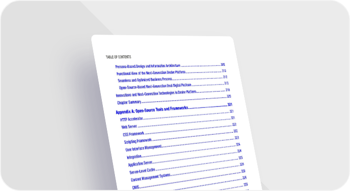 Table of ConTenTs Persona-Based Design and Information Architecture ��������������������������������������������������������� 308 Functional View of the Next-Generation Dealer Platform ���������������������������������������������������� 310 Seamless and Optimized Business Process ������������������������������������������������������������������������ 312 Open-Source-Based Next-Generation Deal Digital Platform ����������������������������������������������� 313 Innovations and Next-Generation Technologies in Dealer Platform ������������������������������������������ 318 Chapter Summary ��������������������������������������������������������������������������������������������������������������������� 320 Appendix A: Open-Source Tools and Frameworks ������������������������������������������������ 321 HTTP Accelerator ����������������������������������������������������������������������������������������������������������������������� 321 Web Server ������������������������������������������������������������������������������������������������������������������������������� 321 CSS Framework ������������������������������������������������������������������������������������������������������������������������ 322 Scripting Framework ���������������������������������������������������������������������������������������������������������������� 322 User Interface Management������������������������������������������������������������������������������������������������������ 323 Integration ��������������������������������������������������������������������������������������������������������������������������������� 324 Application Server ��������������������������������������������������������������������������������������������������������������������� 324 Server-Level Cache ������������������������������������������������������������������������������������������������������������������� 325 Content Management Systems ������������������������������������������������������������������������������������������������� 325 CMIS ������������������������������������������������������������������������������������������������������������������������������������������ 326 SQL Database ���������������������������������������������������������������������������������������������������������������������������� 326 NoSQL Database ������������������������������������������������������
