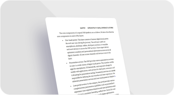 Chapter 1 IntroduCtIon to dIgItal experIenCe platforms The core components of a typical DXP platform are as follows. We have identified the core components in each of the layers: • User touch points: This layer consists of various digital touch points the end user uses during the journey. The end user could use smartphones, desktops, tablets, third party services, or wearable and such devices to access the DXP services. Users expect device- optimized, seamless and personalized information access across all digital channels. All user access channels and devices come in this layer. • Presentation services: The DXP provides various presentation services to cater to a wide variety of digital touch points. This includes mobile apps for smartphones, UI frameworks, and responsive design for mobile web applications, web services for third party consumer, and A/B testing for presentation testing. Presentation services are mainly responsible for defining the user interface and user experience. We elaborate presentation services and user touch points in Chapter 4. • Lean portal services: In this category, the portal provides various complementary presentation capabilities such as personalized experience (user experience based on end user preferences and past history), consistent branding, unified view, forms (for user registration, queries, and such), search engine optimization (SEO) (to make web pages more visible), multilingual presentation, and such. • Lean portal services provide business-friendly controls to manage pages (page creation, layout, web analytics, navigation) and brands. • Lean portal services provide a single-stop-shop view of personalized content by aggregating information from various sources. • Web analytics provide vital real-time customer insights, and help in understanding customer activities and interests. These insights can be used for customer segmentation, trend analysis, and targeted content delivery/contextual recommendations. 7