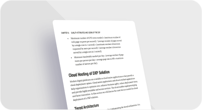 Chapter 8 Quality attributes and sizing of the dXp • Maximum number of CPU cores needed = (maximum number of web page requests per second) / (average number of pages served by a single core in 1 second) + (maximum number of resources requested by users per second) / (average number of resources served by a single core in 1 second). • Minimum bandwidth needed per day = (average number of page views per person per day × average page size in MB × maximum number of visitors per day). Cloud Hosting of DXP Solution Modern digital platforms are available as cloud native applications or they provide a cloud deployment option. Cloud native applications and cloud-enabled applications help organizations to optimize cost, enhance business agility, reduce deployment times, and provide highly available and secure services. The cloud enables rapid prototyping and faster innovation. In this section we will discuss the main factors needed for cloud deployment of a DXP solution. Tiered Architecture We need to identify all the components for implementing the tiered architecture. At a minimum we should configure the following components: • Firewall: This component is needed to filter the traffic and prevent any network-related security threats. • Load balancer: Load balancers are used to evenly distribute requests to all available systems. • Security providers: We need to configure the security components to provide authentication services. • Web server: The web server caches and serves the static content such as images, videos and other binary content. • Application server: The enterprise application is hosted on the application server. 224