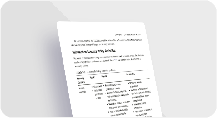 Chapter 7 DXp InformatIon SeCurIty The access control list (ACL) should be defined for all resources. By default, the users should be given least privileges to use any resource. Information Security Policy Definition For each of the security categories, various attributes such as access levels, distribution and storage policy, and such are defined. Table 7-1 is a sample table that defines a security policy. Table 7-1. A sample list of security policies Security Public Private Confidential Concern access • Given to all • restricted (login- and • Strictly on need-to controls • Visitor and permission- based) know- basis guest user • maintain technical, physical, • multilevel authentication & access and administrative safeguards two-factor authentication that for the data. provides additional layer of • Should not be used apart from authentication the agreed upon purposes. • Compartmentalized • autocomplete form fields information should be disabled for • need to sign nondisclosure private data. agreement (nDa) • Confidential information should be masked while displaying. • Confidentiality notice should be displayed on all web pages, reports, screens wherever the data is used. (continued) 205