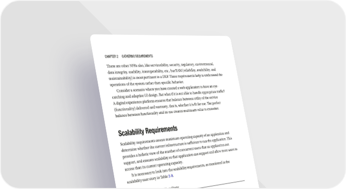 Chapter 2 GatherinG requirements There are other NFRs also, like serviceability, security, regulatory, environmental, data integrity, usability, interoperability, etc., but RAM (reliability, availability, and maintainability) is most pertinent to a DXP. These requirements help to understand the operations of the system rather than specific behavior. Consider a scenario where you have created a web application to have an eye- catching and adaptive UI design. But what if it is not able to handle appropriate traffic? A digital experience platform ensures that balance between utility of the service (functionality) delivered and warranty, that is, whether it is fit for use. The perfect balance between functionality and its use creates maximum value to customer. Scalability Requirements Scalability requirements ensure maximum operating capacity of an application and determine whether the current infrastructure is sufficient to run the application. This provides a holistic view of the number of concurrent users that an application can support, and ensures scalability so that application can support and allow more users to access than its current operating capacity. It is necessary to look into the scalability requirements, as mentioned in the scalability user story in Table 2-8. Table 2-8. Scalability User Story Name Scalability trigger the DXp application should be scalable and load should be distributed across geographical locations. script as a product owner, the DXp application will support 10,000 concurrent users per hour and 1,000,000 transactions per hour. the application should be robust so that it will be able to handle a heavy request load. Geographical load should be distributed across locations so that the application will be available across all geographical locations. acceptance the DXp application is able to support 10,000 concurrent users with 1,000,000 criteria transactions per hour across all geographical locations. 44