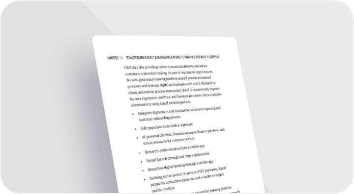 Chapter 10 transforming LegaCy Banking appLiCations to Banking experienCe pLatforms CRM data) for providing relevant recommendations and advice customers in decision making. As part of continuous improvement, the next-generation banking platform should provide automated processes and leverage digital technologies such as IoT, Blockchain, cloud, and robotic process automation (RPA) to continuously improve the user experience, analytics, and business processes. Some examples of innovations using digital technologies are: • Complete digitization and automation of account opening and customer onboarding process • Fully paperless forms with e-signature • AI-powered chatbots, financial advisors, finance planners, and virtual assistants for customer service • Biometric authentication from a mobile app • Virtual branch through real-time collaboration • Branchless digital banking through a mobile app • Enabling online person-to-person (P2P) payments, digital payments, contactless payment, and e-wallet through a mobile interface • Enable new integrations: The next-generation banking platform should be flexible, to enable new integrations to enable future growth and innovations. The integration model of the platform should be built around a lightweight microservices services model. The lightweight services model plays a crucial role in creating an open banking ecosystem and integrating with other platforms and services. • Open platform: The banking platform should expose the services for third-party applications and services to consume the necessary services. The open platform can be leveraged by bank partners such as payment partners, financial partners (who handle cards, insurance, mutual funds, trading, mortgages, etc.), financial technology (fintechs), merchants, digital partners, lending partners, technology partners, telecommunications companies, etc. The banking platform should provide a marketplace for 264