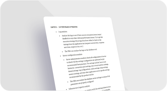 CHAPTeR 9 DXP PeRfORMANCe OPTIMIzATION • Log analysis: • Analyze the logs to see if there are any exceptions/errors/waits/ deadlock or any other obvious performance issues. Try to get the execution timings (from logs/data from tables) to find out the timings from the application tier (request received time, response sent time, response size, etc.) • The DBA can analyze the logs on the database end. • Server configuration analysis: • Server administration needs to check all configurations of server to check if all the settings/configuration are optimized as per recommended best practices. The settings include, but are not limited to: connection pool settings, Java virtual machine settings, thread settings, log configurations, cache settings, heap settings, session settings, and any other application server-specific settings recommended by the product vendor. • The DBA can analyze the database server settings to ensure if all parameters are properly configured. • Infrastructure/capacity analysis: • Infrastructure experts need to verify the existing infrastructure sizing (CPU, memory, disk size, storage, network bandwidth, cache server, CDN, etc.) to check if it is optimal to support the required performance SLAs, content load, and traffic needs. • Network experts need to analyze the network traffic to understand its extent. • Ramp-up testing: • For all performance testing, steadily ramp up the user load starting with 50 users for 30 minutes and then increase the user load to 100 users, 150 users, and so on as per the traffic requirements. • This steady ramp test executed over longer duration reveals the performance issues, memory leaks, and breakpoints. 250