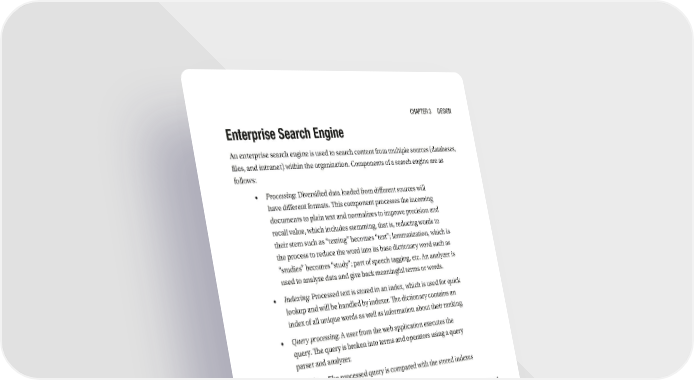 Chapter 3 Design Enterprise Search Engine An enterprise search engine is used to search content from multiple sources (databases, files, and intranet) within the organization. Components of a search engine are as follows: • Processing: Diversified data loaded from different sources will have different formats. This component processes the incoming documents to plain text and normalizes to improve precision and recall value, which includes stemming, that is, reducing words to their stem such as “texting” becomes “text”; lemmatization, which is the process to reduce the word into its base dictionary word such as “studies” becomes “study”; part of speech tagging, etc. An analyzer is used to analyze data and give back meaningful terms or words. • Indexing: Processed text is stored in an index, which is used for quick lookup and will be handled by indexer. The dictionary contains an index of all unique words as well as information about their ranking. • Query processing: A user from the web application executes the query. The query is broken into terms and operators using a query parser and analyzer. • Matching: The processed query is compared with the stored indexes in the dictionary. Now, we look at an enterprise search engine in detail, based on Apache Lucene and its technology stacks: Elastic Stack and Solr Stack. Apache Lucene is able to achieve fast search responses because it searches indexes instead of searching whole text. • Elastic Stack: The Elastic technology stack has multiple components available to build solutions on top of it, such as Beats, Logstash, Elasticsearch, and Kibana, as shown in Figure 3-29, are as follows: • Beats collects the data and parses it and pushes it to Elasticsearch for log analysis. Log analysis can be achieved using Logstash and Kibana. • Logstash can connect to a variety of sources such as Web API, social services, IoT sensors, and databases and data streams like Kafka or Redis, which collect the data and pipeline to Elasticsearch. 109