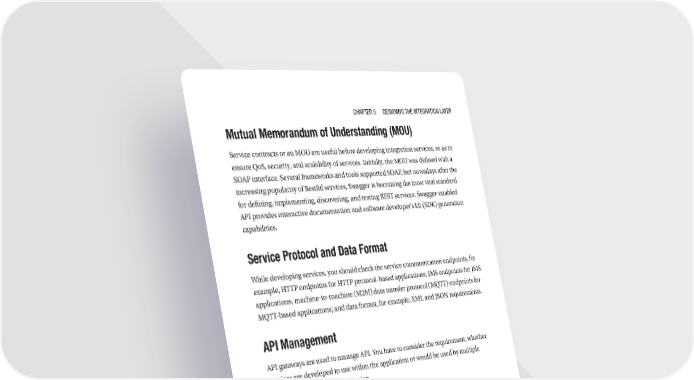 Chapter 5 Designing the integration Layer Mutual Memorandum of Understanding (MOU) Service contracts or an MOU are useful before developing integration services, so as to ensure QoS, security, and scalability of services. Initially, the MOU was defined with a SOAP interface. Several frameworks and tools supported SOAP, but nowadays after the increasing popularity of Restful services, Swagger is becoming the most vital standard for defining, implementing, discovering, and testing REST services. Swagger-enabled API provides interactive documentation and software developer’s kit (SDK) generation capabilities. Service Protocol and Data Format While developing services, you should check the service communication endpoints, for example, HTTP endpoints for HTTP protocol-based applications; JMS endpoints for JMS applications; machine-to-machine (M2M) data transfer protocol (MQTT) endpoints for MQTT-based applications; and data format, for example, XML and JSON requirements. API Management API gateways are used to manage API. You have to consider the requirement, whether services are developed to use within the application or would be used by multiple applications across an organization. Why Do We Need Data Transformation Capabilities in DXP? In a business organization there are multiple applications interacting with each other, therefore the data will be organized and structured in different forms. For example, old systems are built on SOAP architecture but a DXP consumes REST services; hence, to make an old system compatible with a new modernized system, we need data transformation capabilities, whereas the DXP integration layer is capable of integrating with other systems irrespective of technology and framework. The DXP integration layer is capable of consuming data in any format and converts the data as per the DXP UI 167