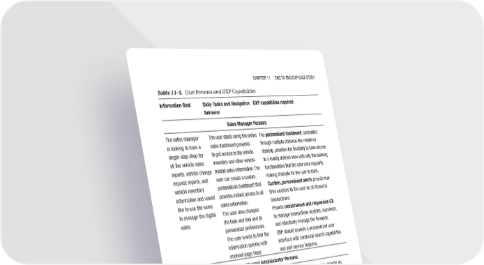 Chapter 11 end to end dXp Case study Table 11-4. User Persona and DXP Capabilities Information Goal Daily Tasks and Navigation DXP capabilities required Behavior Sales Manager Persona the sales manager the user starts using the online the personalized dashboard, accessible is looking to have a sales dashboard provided through multiple channels like mobile or single- stop shop for to get access to the vehicle desktop, provides the flexibility to have access all the vehicle sales inventory and other vehicle- to a readily defined view with only the banking reports, vehicle change related sales information. the functionalities that the user uses regularly, request reports, and user can create a custom, making it simple for the user to track. vehicle inventory personalized dashboard that Custom, personalized alerts provide real- information and would provides instant access to all time updates to the user on all financial like to use the same sales information. transactions. to manage the digital the user also changes provide omnichannel and responsive UX sales. the look and feel and to to manage transactions anytime, anywhere, personalize preferences. and effectively manage the finances. the user wants to find the dXp should provide a personalized user information quickly with interface with contexual search capabilities minimal page hops. and self-service features. Warrant Administrator Persona the warranty the user wants an integrated dXp should be configured to provide an administrator handles platform. integrated dashboard view that can pull multiple operation the user wants real- time the data from desperate systems and areas such as service and configurable reports provide the user an end-to-end view of all management, claims, for claims, repairs, orders, operations and also provide the user with a repair, orders, campaign and campaign and payment personalized interface that can be modified and payment and information. to suite his/her needs. currently has to scan dXp should provide reporting capability that through multiple can be configured/customized to effectively applications to monitor operations. understand the status of dXp should provide a customizable view by the daily operations. adding/removing uI widgets. (continued) 309