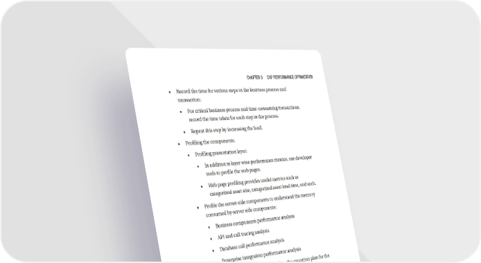 CHAPTeR 9 DXP PeRfORMANCe OPTIMIzATION • Record the time for various steps in the business process and transaction: • For critical business process and time-consuming transactions, record the time taken for each step in the process. • Repeat this step by increasing the load. • Profiling the components: • Profiling presentation layer: • In addition to layer-wise performance metrics, use developer tools to profile the web pages. • Web page profiling provides useful metrics such as categorized asset size, categorized asset load time, and such. • Profile the server-side components to understand the memory consumed by server side components: • Business components performance analysis • API and call tracing analysis • Database call performance analysis • Enterprise integration performance analysis • Profile the database by understanding the execution plan for the queries: • Review the data model to see if it is properly utilized. • Explore the possibilities of using lookup tables and snapshot tables to prepare/cache the data for frequently accessed queries and for static values. 249