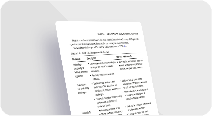 Chapter 1 IntroduCtIon to dIgItal experIenCe platforms Digital experience platforms are the next step in the evolution journey. DXPs provide a preintegrated stack to use and extend for any enterprise digital solution. Some of the challenges addressed by DXPs are shown in Table 1-1. Table 1-1. DXP Challenges and Solutions Challenge Description How DXP Addresses It technology • too many products and technologies • dxps provide preintegrated stack and complexity for adding to the overall technology provide all necessary capabilities for building enterprise complexity. building enterprise digital solutions. application • too many integrations involved products. performance • traditional web platforms tend • dxps are built on a lean model and availability to be “heavy” for installation and offering lean uI frameworks/products challenges maintenance, and pose performance for rich user experience needs. challenges. • Cloud-native dxps are well equipped • too much integration is also causing to handle the availability and on- performance, scalability and demand scalability challenges. availability issues. productivity • the inherent complexity of the • dxps can be configured and extended challenges traditional platforms is resulting in to build needed capabilities. greater time for implementation. • preintegrated technology stack • missing common, reusable and development tools improve component and frameworks. productivity. not aligned with • traditional digital technologies • dxps can be used to implement digital overall digital and products pose challenges strategy, as it provides all the necessary strategy in fully implementing digital building blocks of digital technologies strategy elements such as mobility with extensible architecture. enablement, analytics, and cloud • dxps support and provide modern digital technologies such as collaboration tools, aI tools, and mobile apps. high maintenance • high software licensing and support • a dxp is a single, modern product and infrastructure costs. offering combined functionalities in an cost • high development, testing, and skill overall digital space. costs involved. 13
