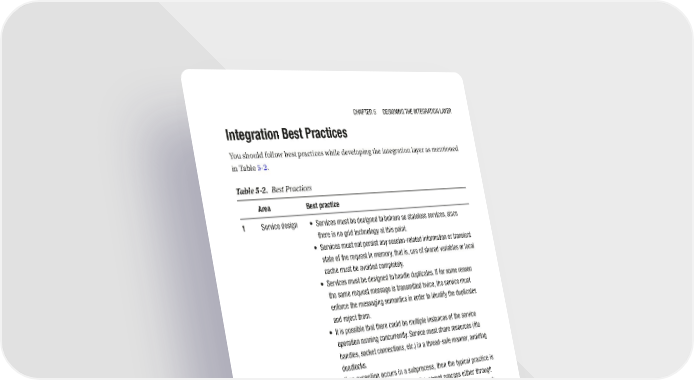 Chapter 5 Designing the integration Layer Integration Best Practices You should follow best practices while developing the integration layer as mentioned in Table 5-2. Table 5-2. Best Practices Area Best practice 1 service design • services must be designed to behave as stateless services, since there is no grid technology at this point. • services must not persist any session-related information or transient state of the request in memory, that is, use of shared variables or local cache must be avoided completely. • services must be designed to handle duplicates. if for some reason the same request message is transmitted twice, the service must enforce the messaging semantics in order to identify the duplicates and reject them. • it is possible that there could be multiple instances of the service operation running concurrently. service must share resources (file handles, socket connections, etc.) in a thread-safe manner, avoiding deadlocks. • if an exception occurs in a subprocess, then the typical practice is to propagate that exception to the parent process either through a “generate error” activity or “rethrow” exception. But, if the sub process is nested deep below from the main process, this could cause a problem since every subprocess must rethrow the error. it is a known fact that rethrow of exceptions is costly, since the entire copy of the stack must be embedded with each throw. hence, it is recommended that we report these exceptions by setting flags like “exception=true” and exiting the process with proper error handling. this should be propagated to the parent process in an optimal manner. (continued) 173