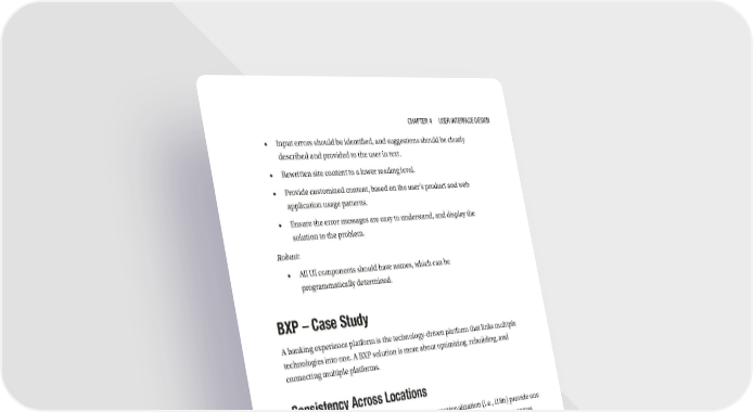 Chapter 4 User InterfaCe DesIgn • Input errors should be identified, and suggestions should be clearly described and provided to the user in text. • Rewritten site content to a lower reading level. • Provide customized content, based on the user’s product and web application usage patterns. • Ensure the error messages are easy to understand, and display the solution to the problem. Robust: • All UI components should have names, which can be programmatically determined. BXP – Case Study A banking experience platform is the technology-driven platform that links multiple technologies into one. A BXP solution is more about optimizing, rebuilding, and connecting multiple platforms. Consistency Across Locations BXP features like localization (i.e., l10n) and internationalization (i.e., i18n) provide one front end that is applicable to all the countries, thereby providing consistency across different regions and countries. The current banking application has multiple screens to support functionality for bill payments and managing payees where there are separate and multiple interactions (screen) for money movement workflow. The BXP provides a solution where there is a single logical user flow for any kind of money movements. Consistency Across Application One of the key aspects of the UX design process is to ensure consistency from a usability and design perspective throughout the application. In the existing application, setting or editing addresses, e-mails, and phone numbers followed different patterns and hence wasn’t intuitive to users. The BXP provides a consistent design approach for all the scenarios. 141