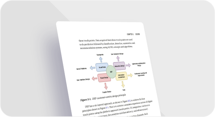 Chapter 3 Design these touch points. Data acquired from these touch points are used to do prediction followed by classification, detection, automation and recommendation systems, using AI/ML concepts and algorithms. Touchpoints User Behavioral Design Social Platforms Brand Value Interaction Design Application and Navigation Design DXP User Interface Design Visual Design Information Continuous Learning and Architecture Improvement Graphic Design Data Figure 3-1. DXP customer-centric design principle DXP has a six-layered approach, as shown in Figure 3-2, to achieve the four principles shown in Figure 3-1. That is to achieve a seamless experience across all digital touch points using the platform approach (touch points, UI, integration, continuous learning and improvement, data analytics and data delivery, and infrastructure). • Touch points: Touch points are also called interaction channels. Each organization needs to understand their own digital strategy, as this will help to understand their touch point needs and create brand value. • User interface: Interactive and intuitive UI help your organization enhance the usability of your products and services. • Continuous learning and improvement: Continuous learning helps you to improve their business process and optimize business workflow, for example, chatbot or AI automation using machine learning (ML) algorithms and neural networks help you to automate and optimize their business process. DXP is designed to understand the context through transaction and learning engines where you can use different ML algorithms to solve problems related to prediction, 63
