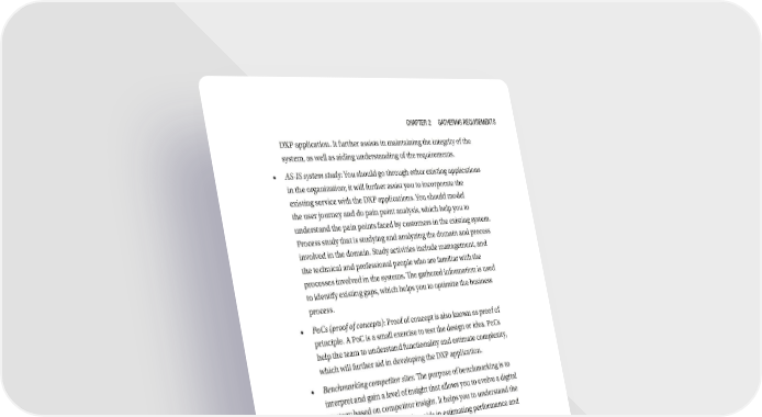Chapter 2 GatherinG requirements DXP application. It further assists in maintaining the integrity of the system, as well as aiding understanding of the requirements. • AS-IS system study: You should go through other existing applications in the organization; it will further assist you to incorporate the existing service with the DXP applications. You should model the user journey and do pain point analysis, which help you to understand the pain points faced by customers in the existing system. Process study that is studying and analyzing the domain and process involved in the domain. Study activities include management, and the technical and professional people who are familiar with the processes involved in the systems. The gathered information is used to identify existing gaps, which helps you to optimize the business process. • PoCs (proof of concepts): Proof of concept is also known as proof of principle. A PoC is a small exercise to test the design or idea. PoCs help the team to understand functionality and estimate complexity, which will further aid in developing the DXP application. • Benchmarking competitor sites: The purpose of benchmarking is to interpret and gain a level of insight that allows you to evolve a digital strategy based on competitor insight. It helps you to understand the potential customer and further aids in estimating performance and capacity-related requirements. • Questionnaires: An effective questionnaire helps you to decide the actual user requirements. The answers can be used to analyze the results. When the number of stake holders is greater, or the resources and funds are less, then a questionnaire is the best method to analyze the requirements. The questionnaire should be well defined and effective. All the questions should be relevant to the requirements. 29