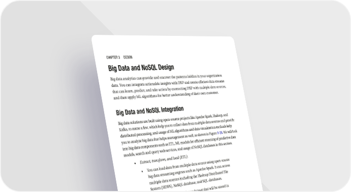 Chapter 3 Design Big Data and NoSQL Design Big data analytics can provide and uncover the patterns hidden in your organization data. You can integrate actionable insights with DXP and create efficient data streams that can learn, predict, and take action by connecting DXP with multiple data sources, and then apply ML algorithms for better understanding of their own customer. Big Data and NoSQL Integration Big data solutions are built using open-source projects like Apache Spark, Hadoop, and Kafka, to name a few, which help you to collect data from multiple data sources and provide distributed processing, and usage of ML algorithms and data visualization methods help you to analyze big data that helps management as well, as shown in Figure 3-26. We will look into big data components such as ETL, ML models for efficient steaming of predictive data models, search and query web services, and usage of NoSQL databases in this section. • Extract, transform, and load (ETL): • You can load data from multiple data source using open-source big data streaming engines such as Apache Spark. It can access multiple data sources including the Hadoop Distributed File System (HDFS), NoSQL database, and SQL-databases. • Collection of elements of your dataset that will be stored in memory or disk across a cluster of machines • A data frame is created to help process large data sets easily. Spark’s dataset and data frame provide an API that allows developers to easily express transformations on domain objects. • Train and test predictive data model: • You can use different kinds of ML algorithms (supervised learning, unsupervised learning, or reinforcement learning) depending upon the nature of problem. 102