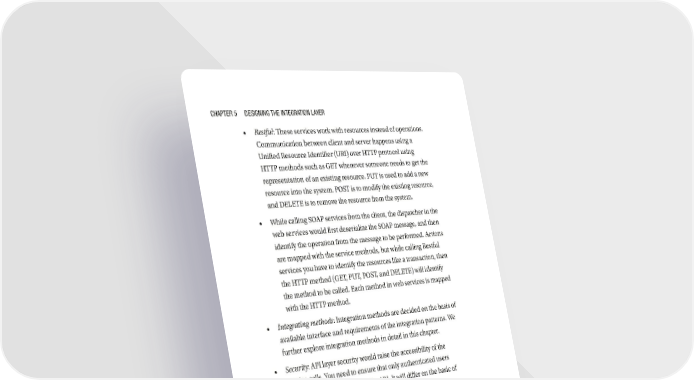 Chapter 5 Designing the integration Layer • Restful: These services work with resources instead of operations. Communication between client and server happens using a Unified Resource Identifier (URI) over HTTP protocol using HTTP methods such as GET whenever someone needs to get the representation of an existing resource. PUT is used to add a new resource into the system. POST is to modify the existing resource, and DELETE is to remove the resource from the system. • While calling SOAP services from the client, the dispatcher in the web services would first deserialize the SOAP message, and then identify the operation from the message to be performed. Actions are mapped with the service methods, but while calling Restful services you have to identify the resources like a transaction, then the HTTP method (GET, PUT, POST, and DELETE) will identify the method to be called. Each method in web services is mapped with the HTTP method. • Integrating methods: Integration methods are decided on the basis of available interface and requirements of the integration patterns. We further explore integration methods in detail in this chapter. • Security: API layer security would raise the accessibility of the service calls. You need to ensure that only authenticated users of the application can access the API. It will differ on the basic of architectural pattern. • Monolithic architecture: In this architecture, the entire application is a process; the security module is implemented to provide authentication and authorization to the user. When a user logs in to the application, the security module of the application authenticates the user. After verifying the user details, a session is created for the user and a unique session ID is provided with the session. The session stores login user information such as name, permissions, and roles. The server is responsible for managing the session, and sends the session ID to the client and back to the server in subsequent requests. This session ID would be used to verify the user details. 152
