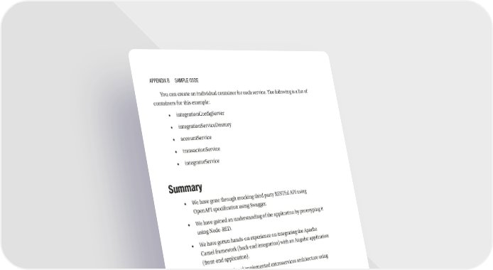 Appendix B SAmple Code You can create an individual container for each service. The following is a list of containers for this example: • integrationConfigServer • integrationServiceDiretory • accountService • transactionService • integratorService Summary • We have gone through mocking third party RESTful API using OpenAPI specification using Swagger. • We have gained an understanding of the application by prototyping it using Node-RED. • We have gotten hands-on experience on integrating the Apache Camel framework (back-end integration) with an Angular application (front-end application). • We understood and implemented microservices architecture using Spring Boot. 364