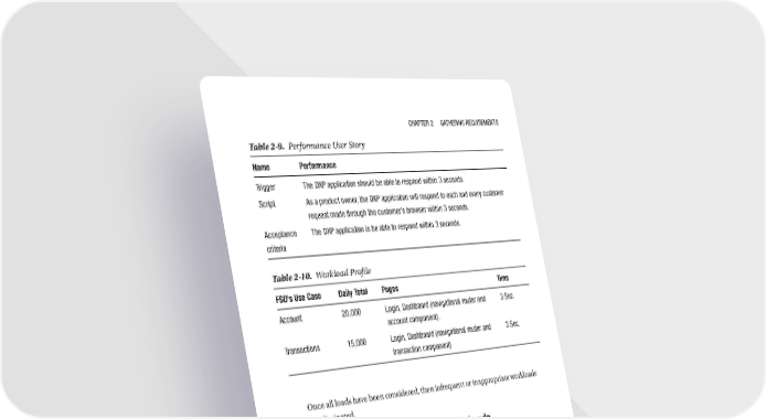 Chapter 2 GatherinG requirements Table 2-9. Performance User Story Name Performance trigger the DXp application should be able to respond within 3 seconds. script as a product owner, the DXp application will respond to each and every customer request made through the customer’s browser within 3 seconds. acceptance the DXp application is be able to respond within 3 seconds. criteria Table 2-10. Workload Profile FSD’s Use Case Daily Total Pages Time account 20,000 Login, Dashboard (navigational router and 3 sec. account component). transactions 15,000 Login, Dashboard (navigational router and 3 sec. transaction component) Once all loads have been considered, then infrequent or inappropriate workloads can be eliminated. Page Response Time at Normal and Peak Loads In supporting 10,000 users, the DXP should certify that performance should not fall below the mentioned level. • 80% of all pages for customers respond in 3 seconds or less. • Transaction and Account pages should respond in 3 seconds or less. In Figure 2-8 and Table 2-11, consider the following: • Peak load: When the maximum number of users engages with your application, as shown in Figure 2-8: Peak Load • Normal load: When frequent users engage with your application, as shown in Figure 2-8: Normal Load 47