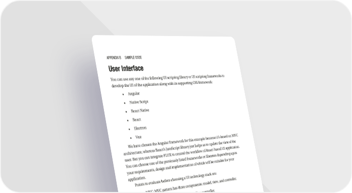 Appendix B SAmple Code User Interface You can use any one of the following UI scripting library or UI scripting frameworks to develop the UI of the application along with its supporting CSS framework: • Angular • Native Script • React Native • React • Electron • Vue We have chosen the Angular framework for this example because it’s based on MVC architecture, whereas React’s JavaScript library just helps us to update the view of the user. But you can integrate FLUX to control the workflow of React-based UI application. You can choose one of the previously listed frameworks or libraries depending upon your requirements, design and implementation of which will be suitable for your application. Points to evaluate before choosing a UI technology stack are: • MVC: MVC pattern has three components: model, view, and controller. • Model is bound with view as well as controller. • View is a user interface that binds the model with the Document Object Model (DOM) and display data to the user and also enables the user to modify the model. • Controllers are responsible for controlling the flow of the application; if you make a web services request the controller is responsible for providing a response back to the application. The MVC pattern provides control over business logic implemented on UI scripting; hence you should consider whether your application needs the MVC pattern. • Data binding: Data binding would help you to establish a relationship between your business logic with the DOM. Angular has two-way binding, whereas React has one-way binding. 334