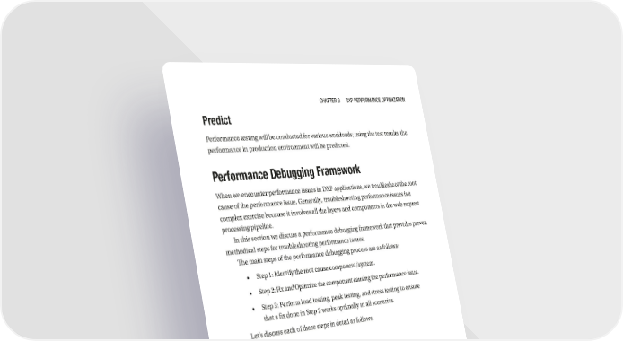 CHAPTeR 9 DXP PeRfORMANCe OPTIMIzATION Predict Performance testing will be conducted for various workloads; using the test results, the performance in production environment will be predicted. Performance Debugging Framework When we encounter performance issues in DXP applications, we troubleshoot the root cause of the performance issue. Generally, troubleshooting performance issues is a complex exercise because it involves all the layers and components in the web request processing pipeline. In this section we discuss a performance debugging framework that provides proven methodical steps for troubleshooting performance issues. The main steps of the performance debugging process are as follows: • Step 1: Identify the root cause component/system. • Step 2: Fix and Optimize the component causing the performance issue. • Step 3: Perform load testing, peak testing, and stress testing to ensure that a fix done in Step 2 works optimally in all scenarios. Let’s discuss each of these steps in detail as follows. Identify the Root Cause We need to check the performance at each layer to understand the component causing the performance issue. This is often the most complex step in the process. We need to devise test methods for each layer and for components involved in the web request processing pipeline. In addition, we need to do runtime profiling of the application and log analysis to get more insights into the problem-causing element. Following are various methods to identify the performance root cause: • Perform layer-wise performance testing. Identify the time taken at each layer involved in the web request processing pipeline. Starting from the presentation layer (Java server pages/active server pages) to the database layer, get the average execution time (for more than ten iterations). At a minimum, we need the execution time for following: • Average load time taken by the overall web page 247
