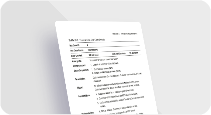 Chapter 2 GatherinG requirements Table 2-2. Transaction Use Case Details Use Case ID: 2 Use Case Name: Transactions Date Created: XX-XX-XXXX Last Revision Date: XX-XX- XXXX User goals: to be able to view the transaction history Primary actors: 1. Logged-in customer of the aBC bank Secondary actors: 1. Core banking system (CBs) 2. simple mail transport protocol (smtp) Description: Customer can view the ministatement. Customer can download or e-mail statement. Trigger: By default, customer wants ministatement displayed on the screen. Customer should be able to download statement on their machine. Preconditions: 1. Customer should be an existing registered customer. 2. Customer will be logged in to the aBC online banking site. 3. Customer has selected the account to view statement and account details. Postconditions: 1. mini or detailed statement is displayed on the screen. 2. Detailed statement is downloaded in pDF format. Functional flow: Following are the points to be considered for transaction details: account statement 1. after login, customer will be landed on dashboard. 2. Dashboard will contain the transaction ui component (widget), which will display ministatement. 3. ministatement will have details of last ten transactions. 4. ministatement will be displayed on the screen with following details: date, expense type, description, credit or debited amount, and balance. 5. Customer can filter the transactions by selecting From date and to date to display detailed statement. (continued) 35