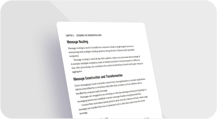 Chapter 5 Designing the integration Layer Message Routing Message routing is used to handle the scenarios where a single logical service is interacting with multiple existing systems using the list of dynamically specified recipients. Message routing is used along with a splitter, where one processes the exchange if it contains multiple recipients, each of which may have to be processed in a different way; after processing, one combines the results of individual related exchanges using an aggregator. Message Construction and Transformation Event messaging is used to transfer events from one application to another application, which is identified by a correlation identifier that contains a return address and is handled by a request reply message. Messages are wrapped in an envelope so that the existing system participating in a messaging system can establish a secure message header encryption method. Content filter and claim check patterns deal with the volumes of data, where large messages are handled but one is interested only in few data items from the entire message. Integration Patterns Integration patterns are the solution to commonly occurring integration problems, which are mainly divided as channel pattern (how messages are transported across channels), routing pattern (how messages routed between sender and receiver), transformation pattern (transformation of messages as per sender and receiver), and endpoints (how messages are consumed and exposed). Pattern – Simple (Internal) Integration The publisher–subscriber design pattern ensures that multiple applications consume the message at a time. Information standardization is based on source and synchronization of target systems with data required for its processing. The main focus is to synchronize information based on business events, thus removing any processing delays and overcoming the pain of managing a batch window. 162