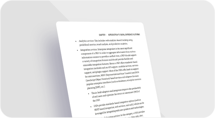 Chapter 1 IntroduCtIon to dIgItal experIenCe platforms • Analytics services: This includes web analytics-based tracking using predefined metrics, trend analysis, and predictive analytics. • Integration services: Enterprise integration is the most significant component of a DXP. In order to aggregate information from various information sources to provide a unified view, a DXP should support a variety of integration formats and should provide flexible and extensible integration features. Hence a DXP offers standards-based integration methods such as API support, modular services, services support, and plugin support. Most of the DXPs offer built-in support for microservices, REST (Representational State Transfer) and JSON (JavaScript Object Notation)-based services and adaptors for most popular enterprise interfaces (such as databases, enterprise resource planning [ERP], etc.) • The in-built adaptors and integrators improve the productivity of end users and optimize the return on investment (ROI) of the DXP. • DXPs provide standards-based integration options (such as REST- based integration, web services, and such), which can be leveraged for integrating with new products and technologies. • Social and collaboration services: In this category, a DXP provides various collaboration features such as forums, blog, wiki, chat, knowledge base, messengers, communities, calendars, email, and such. These features enable end users to share the information and facilitate a self-service model. The social capabilities enable users to collaborate, harness collective intelligence, socialize, and improve productivity. • Social and collaboration enable users to collaborate and engage customers at social touch points. • Workflow and orchestration: DXPs enable designing and implementing agile, automated, and dynamic business processes through workflow modeling, a configurable rules engine, and workflow governance. 9