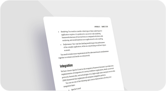 Appendix B SAmple Code • Rendering: You need to consider which type of data rendering your application requires; it is preferred to use server-side rendering frameworks because of less load time as compared with client-side rendering, and would optimize your application for web crawling. • Performance: Two-way data binding would impact the performance of the complex application, while one-way binding would not impact as much. You need to look at your requirement and the aforementioned considerations together to evaluate and decide on a framework. Integration We have chosen Apache Camel as the integration framework because it provides easy implementation of integration of a variety of different applications, which use several protocols, frameworks, and technologies. It is a lightweight mini enterprise service bus (ESB) framework that implements all enterprise integration patterns. You can use one of the following open-source frameworks to develop your integration layer: • Apache Camel • Apache ServiceMix • WSO2 ESB • Open Source Mule ESB • Open Source Talend ESB You can use open-source mini-ESB frameworks if you want to integrate two to three protocols and technologies, for example: • Reading the files • Soap to REST conversions • XML to JSON conversions • Reading or writing to data streams Otherwise you can also use commercial ESB products for large-scale integration projects. 335