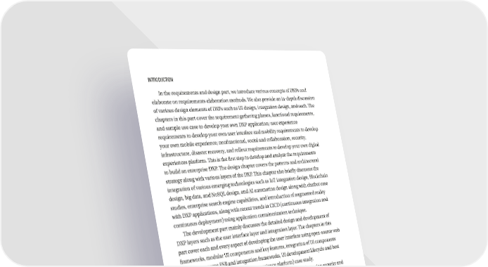 InTroduCTIon In the requirements and design part, we introduce various concepts of DXPs and elaborate on requirements elaboration methods. We also provide an in-depth discussion of various design elements of DXPs such as UI design, integration design, and such. The chapters in this part cover the requirement gathering phases, functional requirements, and sample use case to develop your own DXP application; user experience requirements to develop your own user interface and mobility requirements to develop your own mobile experience; nonfunctional, social and collaboration, security, infrastructure, disaster recovery, and rollout requirements to develop your own digital experiences platform. This is the first step to develop and analyze the requirements to build an enterprise DXP. The design chapter covers the patterns and architectural strategy along with various layers of the DXP. This chapter also briefly discusses the integration of various emerging technologies such as IoT integration design, Blockchain design, big data, and NoSQL design, and AI automation design along with chatbot case studies, enterprise search engine capabilities, and introduction of augmented reality with DXP applications, along with recent trends in CICD (continuous integration and continuous deployment) using application containerization technique. The development part mainly discusses the detailed design and development of DXP layers such as the user interface layer and integration layer. The chapters in this part cover each and every aspect of developing the user interface using open-source web frameworks, modular UI components and key features, integration of UI components using open source ESB and integration frameworks, UI development lifecycle and best practices, along with a BXP (Banking experience platform) case study. In the security part, we provide an elaborate discussion of information security and overall security of DXPs. The chapters in this part cover the concepts and best practices while developing an application’s security, along with information security policy and principles. The infrastructure/NFR part discusses various quality and nonfunctional attributes such as performance, infrastructure sizing, and such. The chapters in this part cover the NFR(nonfunctional requirements), that is, scalability, availability, performance, modularity, extensibility, and security of the DXP’s application along with quality attributes such as usability, configurability, stability, interoperability, efficiency, flexibility, and maintainability of the platform. Finally, we wrap up with an elaborate digital transformation case study of a legacy system in the last chapter. The case study chapter provides insights into the digital transformation of a legacy application to a Digital experience platform. It covers concepts xxiv