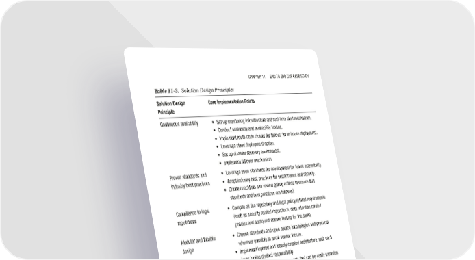 Chapter 11 end to end dXp Case study Table 11-3. Solution Design Principles Solution Design Core Implementation Points Principle Continuous availability • set up monitoring infrastructure and real-time alert mechanism. • Conduct scalability and availability testing. • Implement multi-node cluster for failover for in house deployment. • Leverage cloud deployment option. • set up disaster recovery environment. • Implement failover mechanism. proven standards and • Leverage open standards for development for future extensibility. industry best practices • adopt industry best practices for performance and security. • Create checklists and review gating criteria to ensure that standards and best practices are followed. Compliance to legal • Compile all the regulatory and legal policy related requirements regulations (such as security related regulations, data retention-related policies and such) and ensure testing for the same. Modular and flexible • Choose standards and open source technologies and products design wherever possible to avoid vendor lock in. • Implement layered and loosely coupled architecture, with each layer having distinct responsibility. • Create modular solution components that can be easily extended. high usability • Implement accessibility standards. • Conduct usability testing on all supported browsers and devices. • provide contextual help, FaQ, and contextual menus. • provide intuitive information architecture and user-friendly navigation structure. • provide consistent user interface. • provide search for all interfaces. service-oriented • use services for exposing and consuming services. architecture • Implement lightweight rest-based services to integrate with external interfaces. (continued) 305
