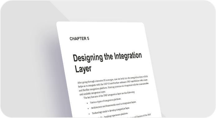 CHAPTER 5 Designing the Integration Layer After going through extensive UI concepts, now we look into the integration layer, which helps us to integrate with the DXP UI and further enhance DXP capabilities with a lean and flexible integration platform. Existing systems are integrated with the maintainable and scalable integration layer. The key features of the DXP integration layer are the following: • Various types of integration platform. • Architecture and frameworks used in integration layers. • Technology stack to develop integration layer. • Case study – banking experience platform. At the outset, we take into the picture the introduction and features of the DXP integration layer. DXP integration concepts help you make effective decisions on Web API (application program interface) management tools to integrate services with the DXP UI. According to the business requirement, the API management tool can be used and integrated with the DXP. Business requirements can help you to focus on understanding the basic requirements of the integration, for example, some requirements focus on portal and some on analytics services, so decisions should be made as per the requirement. © Shailesh Kumar Shivakumar, Sourabhh Sethii 2019 149 S. K. Shivakumar and S. Sethii, Building Digital Experience Platforms, https://doi.org/10.1007/978-1-4842-4303-9_5