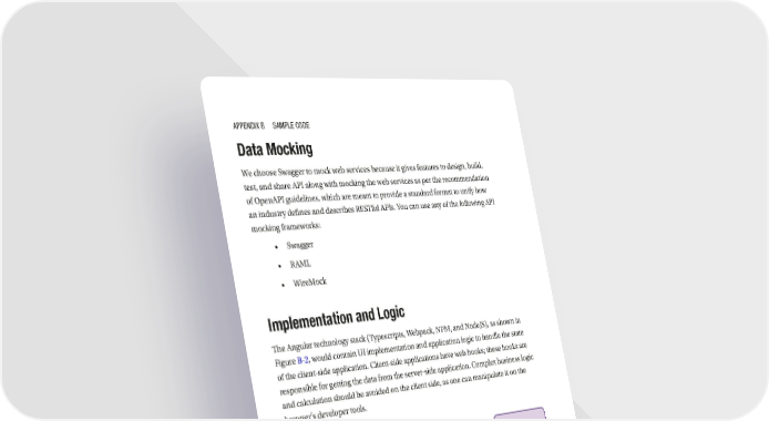 Appendix B SAmple Code Data Mocking We choose Swagger to mock web services because it gives features to design, build, test, and share API along with mocking the web services as per the recommendation of OpenAPI guidelines, which are meant to provide a standard format to unify how an industry defines and describes RESTful APIs. You can use any of the following API mocking frameworks: • Swagger • RAML • WireMock Implementation and Logic The Angular technology stack (Typescripts, Webpack, NPM, and NodeJS), as shown in Figure B-2, would contain UI implementation and application logic to handle the state of the client-side application. Client-side applications have web hooks; these hooks are responsible for getting the data from the server-side application. Complex business logic and calculation should be avoided on the client side, as one can manipulate it on the browser’s developer tools. Angular REST API Apache Camel REST API Swagger UI Logic Integration Logic Mocking API Business Logic Services Figure B-2. Implementation and logic 336