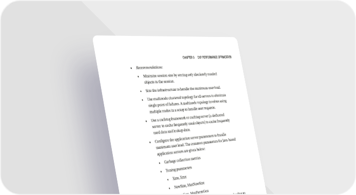 CHAPTeR 9 DXP PeRfORMANCe OPTIMIzATION • Recommendations: • Minimize session size by storing only absolutely needed objects in the session. • Size the infrastructure to handle the maximum user load. • Use multinode clustered topology for all servers to eliminate single point of failures. A multinode topology involves using multiple nodes in a setup to handle user requests. • Use a caching framework or caching server (a dedicated server to cache frequently used objects) to cache frequently used data and lookup data. • Configure the application server parameters to handle maximum user load. The common parameters for Java-based application servers are given below: • Garbage collection metrics • Tuning parameters • Xms, Xmx • NewSize, MaxNewSize • PermGen, MaxPermGen • Performance issue: Inappropriate deployment architecture leading to single point of failure. Few common symptoms given below: • Multiple applications were deployed on the same server in production and pre-production environments. Performance testing revealed that this setup was not scalable. • CPU utilization graphs showed spikes during normal load testing. This was attributed to problems with one of the applications, which was not scalable. • Applications, admin functionality, and search modules shared the same server. This led to performance issues in search and admin functionality. 253