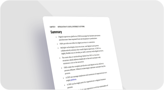 Chapter 1 IntroduCtIon to dIgItal experIenCe platforms Summary • Digital experience platforms (DXPs) manage the business processes and decrease time required from development to production. • DXPs provide cost effective digital services to customers. • Multiple technologies, lean structure, and digital touch points collaboratively enhance the overall digital experience. A DXP is a highly flexible way to develop as well as interact with digital services. • The main idea or methodology behind the DXP is it has lean structure, which delivers maximum to the end customer with minimum cost on the resources. • DXPs make the complete production and digital service delivery process efficient. Different technologies optimize and speed up the process. • A DXP can manage employees and customers of organizations on a single platform. • A DXP can be single point for organizations to digitize business process. • A DXP provides holistic user experience to all the stakeholders of organization. 26