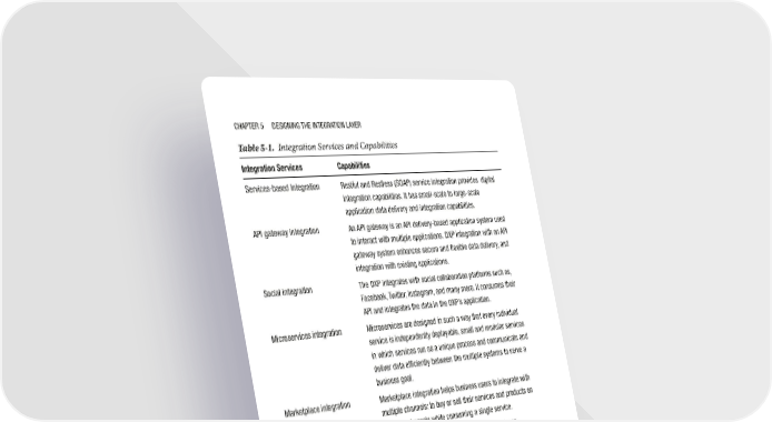 Chapter 5 Designing the integration Layer Table 5-1. Integration Services and Capabilities Integration Services Capabilities services-based integration restful and restless (soap) service integration provides digital integration capabilities. it has small-scale to large-scale application data delivery and integration capabilities. api gateway integration an api gateway is an api delivery-based application system used to interact with multiple applications. DXp integration with an api gateway system enhances secure and flexible data delivery, and integration with existing applications. social integration the DXp integrates with social collaboration platforms such as, Facebook, twitter, instagram, and many more. it consumes their api and integrates the data in the DXp’s application. Microservices integration Microservices are designed in such a way that every individual service is independently deployable, small and modular services in which services run as a unique process and communicate and deliver data efficiently between the multiple systems to serve a business goal. Marketplace integration Marketplace integration helps business users to integrate with multiple channels: to buy or sell their services and products on different channels while consuming a single service. esB (enterprise service bus) esB is used in medium-scale to large-scale business requirements where multiple systems inter with each other, for example, a banking domain. in-built Connectors an in-built connector has capabilities to connect a DXp’s application to multiple components, such as a JDBC connector used to access a database or grpC connectors used to do remote procedure calls, etc. pluggable adapters integration frameworks have various pluggable adaptors such as JMs adapter, data stream adaptors, etc. these adapters are used to access and convert data from one form to another form. you can access data streams using these adaptors. 156