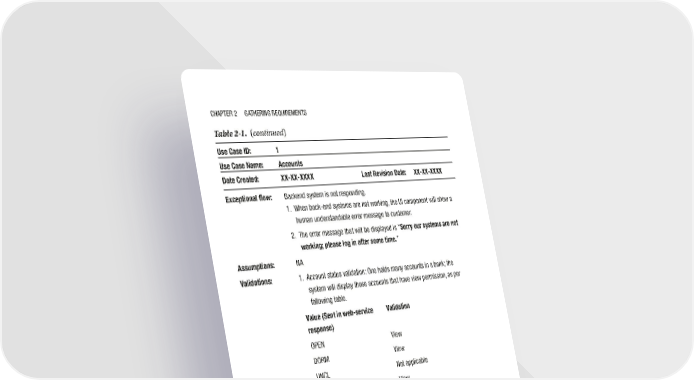 Chapter 2 GatherinG requirements Table 2-1. (continued) Use Case ID: 1 Use Case Name: Accounts Date Created: XX-XX-XXXX Last Revision Date: XX-XX- XXXX Exceptional flow: Backend system is not responding. 1. When back-end systems are not working, the ui component will show a human understandable error message to customer. 2. the error message that will be displayed is “Sorry our systems are not working; please log in after some time.” Assumptions: na Validations: 1. account status validation: One holds many accounts in a bank; the system will display those accounts that have view permission, as per following table. Value (Sent in web-service Validation response) Open View DOrm View unCL not applicable inOp View CLOs not applicable preCreateD not applicable Track changes: na Out of scope: na 34