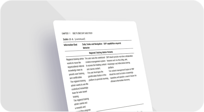 Chapter 11 end to end dXp Case study Table 11-4. (continued) Information Goal Daily Tasks and Navigation DXP capabilities required Behavior Regional Training Admin Persona regional training admin the user uses the centralized dXp should provide real-time collaboration wants to reuse the content management system features such as chat, blog, wiki, organizational internal to access the training content messenger, and information sharing knowledge base to and course content. platform. provide user training the user leverages the the content management feature of dXp and certification. gamification feature of the should be used to create a knowledge the regional training platform to promote learning. repository and provide a search feature for admin wants to use the efficient information discovery. centralized knowledge base for web- based training. the regional training admin carries out a rewards and recognition program. Functional View of the Next-Generation Dealer Platform A functional view of the next-generation dealer platform is depicted in Figure 11-4. 310