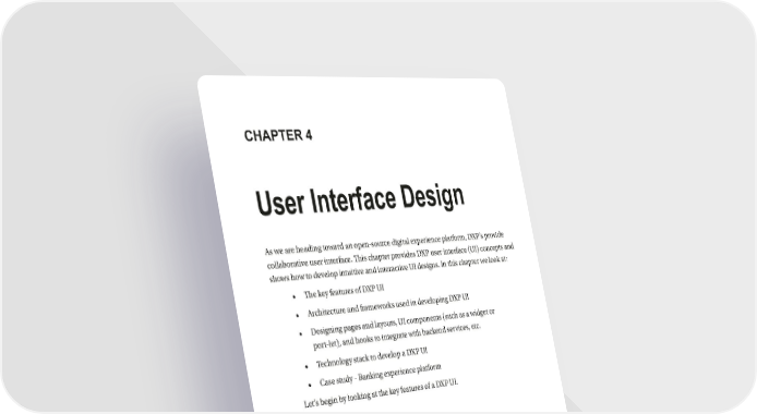 CHAPTER 4 User Interface Design As we are heading toward an open-source digital experience platform, DXP’s provide collaborative user interface. This chapter provides DXP user interface (UI) concepts and shows how to develop intuitive and interactive UI designs. In this chapter we look at: • The key features of DXP UI • Architecture and frameworks used in developing DXP UI • Designing pages and layouts, UI components (such as a widget or port-let), and hooks to integrate with backend services, etc. • Technology stack to develop a DXP UI • Case study - Banking experience platform Let’s begin by looking at the key features of a DXP UI. Key Features DXP user interfaces are built upon the modern web development approach, using the latest web frameworks and library. Let’s delve into the digital experience features and then look into the approach to design and develop the UI. Simplified Approach A DXP provides a reusable and intuitive UI. It provides techniques to help create a fancy, and at the same time elegant, UI and enhance the user experience (UX). The object- oriented programming approach makes the components reusable and is developer friendly. © Shailesh Kumar Shivakumar, Sourabhh Sethii 2019 119 S. K. Shivakumar and S. Sethii, Building Digital Experience Platforms, https://doi.org/10.1007/978-1-4842-4303-9_4