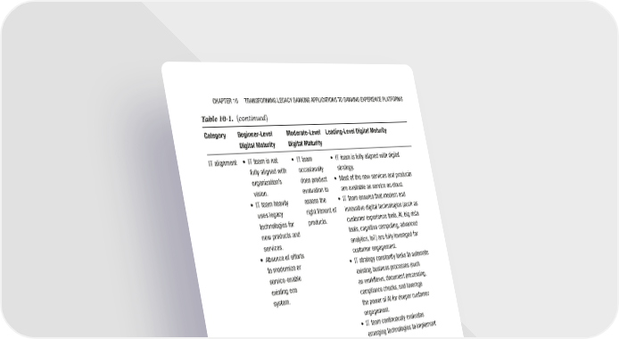 Chapter 10 transforming LegaCy Banking appLiCations to Banking experienCe pLatforms Table 10-1. (continued) Category Beginner-Level Moderate-Level Leading-Level Digital Maturity Digital Maturity Digital Maturity it alignment • it team is not • it team • it team is fully aligned with digital fully aligned with occasionally strategy. organization’s does product • most of the new services and products vision. evaluation to are available as service on cloud. • it team heavily assess the • it team ensures that modern and uses legacy right fitment of innovative digital technologies (such as technologies for products. customer experience tools, ai, big data new products and tools, cognitive computing, advanced services. analytics, iot) are fully leveraged for • absence of efforts customer engagement. to modernize or • it strategy constantly looks to automate service-enable existing business processes (such existing eco as workflows, document processing, system. compliance checks, and leverage the power of ai for deeper customer engagement. • it team continuously evaluates emerging technologies to implement digital strategy. Business • Longer time to • Business • Well-defined and agile processes that agility market. typical obtains end are responsive to business needs and release cycles last user feedback expectations from 6–8 months. very rarely. • Continuous competitive benchmarking • Business rarely and continuous improvement gets feedback • faster time to market from end users • Quick to integrate and implement and does innovative technologies • typical releases happen on a monthly basis using continuous integration tools. (continued) 285