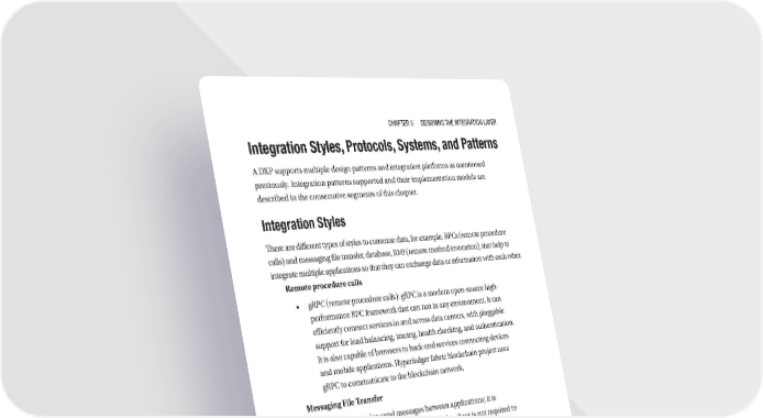 Chapter 5 Designing the integration Layer Integration Styles, Protocols, Systems, and Patterns A DXP supports multiple design patterns and integration platforms as mentioned previously. Integration patterns supported and their implementation models are described in the consecutive segments of this chapter. Integration Styles There are different types of styles to consume data, for example, RPCs (remote procedure calls) and messaging file transfer, database, RMI (remote method invocation), that help to integrate multiple applications so that they can exchange data or information with each other. Remote procedure calls • gRPC (remote procedure calls): gRPC is a modern open-source high- performance RPC framework that can run in any environment. It can efficiently connect services in and across data centers, with pluggable support for load balancing, tracing, health checking, and authentication. It is also capable of browsers to back-end services connecting devices and mobile applications. Hyperledger fabric blockchain project uses gRPC to communicate to the blockchain network. Messaging File Transfer • JMS: It is used to send messages between applications; it is asynchronous in nature, which means the client is not required to send a request, and the message will arrive automatically to the client. It is of two types. One is the point-to-point messaging domain, where one message is delivered to one receiver only and a queue is used to achieve that. The other is the publisher-subscriber messaging domain, which is like broadcasting in that one message is delivered to all the subscribers; to achieve that, a destination called a topic is used to hold and deliver messages. • MQTT (Message Queuing Telemetry Transport): MQTT is a publisher-subscriber based messaging protocol that works on top of the (Transmission Control Protocol/Internet Protocol) TCP/IP protocol. It is designed for constrained devices with low bandwidth. It is best suited for IoT-based applications, as it allows you to send commands to controls, and to read and publish from IoT sensors. 157