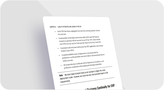 Chapter 8 Quality attributes and sizing of the dXp • Each VPC has been segregated into tiers by creating separate subnets for each tier. • Connectivity to the back-end services like LDAP and IAM that are hosted on-premise will be secured via an IP Sec VPN. There will be two VPN’s set up: one for Prod and the other for the Non-Prod VPC. • Customers and end users will access the DXP application over Secure Sockets Layer (SSL). • A multiavailability zone configuration is recommended for production, as this provides zone level failure and automated failover within seconds. • All nonproduction workloads will be deployed as standalone, and production workloads will be deployed with high availability. Note We have taken amazon Cloud as an example to depict the cloud deployment model. however, we could use any cloud provider based on the requirements. Disaster Recovery and Business Continuity for DXP Applications Disaster recovery (DR) ensures high availability during unexpected events such as a natural disaster. A robust DR strategy is needed in ensuring business continuity. This section elaborates the DR process for DXP applications. The high-level steps in a DR strategy are given in Figure 8-2. 228