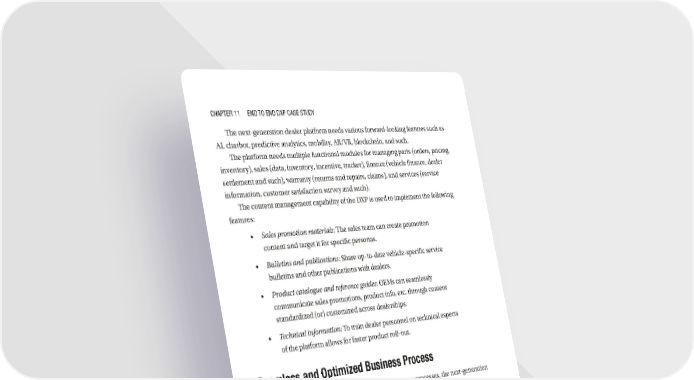 Chapter 11 end to end dXp Case study The next-generation dealer platform needs various forward-looking features such as AI, chatbot, predictive analytics, mobility, AR/VR, blockchain, and such. The platform needs multiple functional modules for managing parts (orders, pricing, inventory), sales (data, inventory, incentive, tracker), finance (vehicle finance, dealer settlement and such), warranty (returns and repairs, claims), and services (service information, customer satisfaction survey and such). The content management capability of the DXP is used to implement the following features: • Sales promotion materials: The sales team can create promotion content and target it for specific personas. • Bulletins and publications: Share up-to-date vehicle-specific service bulletins and other publications with dealers. • Product catalogue and reference guides: OEMs can seamlessly communicate sales promotions, product info, etc. through content standardized (or) customized across dealerships. • Technical information: To train dealer personnel on technical aspects of the platform allows for faster product roll-out. Seamless and Optimized Business Process In order to address the challenges with existing business processes, the next-generation dealer platform is optimized to provide following features: • One-stop deal processing and single-click submission of multiple artifacts for dealers • Real-time incentive inquiry from multiple devices (mobile, iPad, desktop) • Real-time incentive validation on submission of deal to avoid postsubmission changes and reconciliation issues • Real-time updates on the artifact status A sample optimization of end-to-end deal processing flow is depicted in Figure 11-5. 312