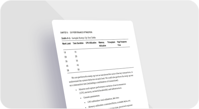 CHAPTeR 9 DXP PeRfORMANCe OPTIMIzATION Table 9-2. Sample Ramp-Up Test Table Work Load Time Duration CPU Utilization Memory Throughput Page Response Utilization Time 10 10 20 20 30 30 40 40 50 50 We can perform the ramp-up test as mentioned for each of the key transactions, to understand the system behavior at each load. We could also perform the ramp-up test on a transaction mix (including a combination of transactions). • Monitor and capture performance statistics of server resources (CPU, memory, network bandwidth) and infrastructure. • Generic parameters: • CPU utilization: total utilization, idle time • Memory utilization: committed bytes, available bytes, etc. • Page performance: page response time, perceived response time, time to first byte • Physical disk: read, write, and latency • Throughput • Instrument code with timers for method / code level timing • Server side parameters: connection pool parameters, thread pool parameters, etc. • Network monitors • Profiling, code coverage, and memory debuggers 242