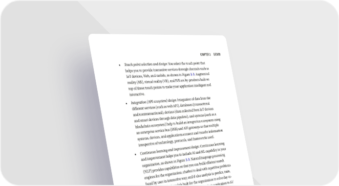 Chapter 3 Design • Touch point selection and design: You select the touch point that helps you to provide interactive services through channels such as IoT devices, Web, and mobile, as shown in Figure 3-3. Augmented reality (AR), virtual reality (VR), and IVR are by-products built on top of these touch points to make your application intelligent and interactive. • Integration (API ecosystem) design: Integration of data from the different services (such as web API), databases (transactional and nontransactional), devices (data collected from IoT devices and smart devices through data pipeline), and systems (such as a blockchain ecosystem) help to build an integration ecosystem using an enterprise service bus (ESB) and API gateways so that multiple systems, devices, and applications connect and transfer information irrespective of technology, protocols, and frameworks used. • Continuous learning and improvement design: Continuous learning and improvement helps you to include AI and ML capability in your organization, as shown in Figure 3-3. Natural language processing (NLP) provides capabilities so that you can build efficient search engines for the organization; chatbot to deal with repetitive problems faced by user in interactive way; and if-else analysis to predict, train, and test ML and AI models built for the organization to solve day-to- day problems. Across industries, one can turn their application to AI/ ML-driven smart applications that help to drive automation using devices such as IoT devices, mobile phones, etc. We will look into the libraries and frameworks used to develop it in AI automation design and Big data and NoSQL design in this chapter. • Data design: Data pipelines, and database design and approaches help you to provide big data analysis capability to your business. AI-ML is so powerful in terms of what it can do but it needs tons of data to learn, hence to manage the data in real-time you should use a distributed data approach, hence data pipelines are introduced. • Infrastructure design: Digital strategies need to engage users with a high-performing experience regardless of the location where it is deployed. You can use cloud infrastructure or standalone server 67