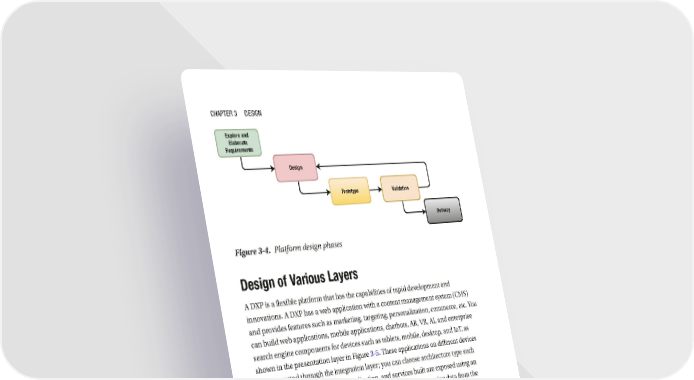 Chapter 3 Design Explore and Elaborate Requirements Design Prototype Validation Delivery Figure 3-4. Platform design phases Design of Various Layers A DXP is a flexible platform that has the capabilities of rapid development and innovations. A DXP has a web application with a content management system (CMS) and provides features such as marketing, targeting, personalization, commerce, etc. You can build web applications, mobile applications, chatbots, AR, VR, AI, and enterprise search engine components for devices such as tablets, mobile, desktop, and IoT, as shown in the presentation layer in Figure 3-5. These applications on different devices are connected through the integration layer; you can choose architecture type such as microservices or monolithic application, and services built are exposed using an ESB and API gateway. Business logic is implemented while accessing data from the data access layer and exposed using the integration layer, as shown in the figure. The middleware layer is responsible for implementing NFRs such as reliability, security, accessibility, and scalability, etc. 70