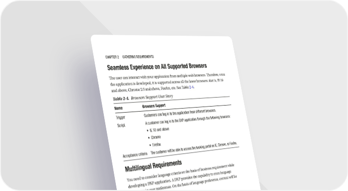 Chapter 2 GatherinG requirements Seamless Experience on All Supported Browsers The user can interact with your application from multiple web browsers. Therefore, once the application is developed, it is supported across all the latest browsers: that is, IE 10 and above, Chrome 2.0 and above, Firefox, etc. See Table 2-4. Table 2-4. Browsers Support User Story Name Browsers Support trigger Customers can log in to the application from different browsers. script a customer can log in to the BXp application through the following browsers: • ie 10 and above • Chrome • Firefox acceptance criteria the customer will be able to access the banking portal on ie, Chrome, or Firefox. Multilingual Requirements You need to consider language criteria on the basis of business requirement while developing a DXP application. A DXP provides the capability to store language preference in user preference. On the basis of language preference, content will be shown to the user. See Table 2-5. Table 2-5. Language Support User Story Name Language Support trigger the customer can select the language of the content. script a customer can select the preferred language while registering into the BXp portal. One can select from the following languages: • english • hindi • German • French after login to the BXp portal, one would get the content according to one’s preferred language. acceptance criteria the customer is able to get content on the basis of preferred language. 38
