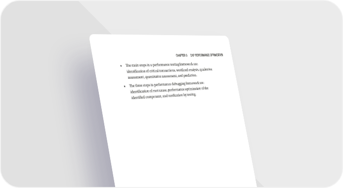 CHAPTeR 9 DXP PeRfORMANCe OPTIMIzATION • The main steps in a performance testing framework are: identification of critical transactions, workload analysis, qualitative assessment, quantitative assessment, and prediction. • The three steps in performance debugging framework are: identification of root cause, performance optimization of the identified component, and verification by testing. 259