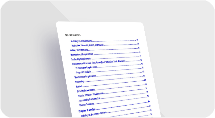 Table of ConTenTs Multilingual Requirements ���������������������������������������������������������������������������������������������������� 38 Navigation Elements, Menus, and Search ����������������������������������������������������������������������������� 39 Mobility Requirements ���������������������������������������������������������������������������������������������������������������� 41 Nonfunctional Requirements ������������������������������������������������������������������������������������������������������ 43 Scalability Requirements ������������������������������������������������������������������������������������������������������������ 44 Performance–Response Time, Throughput, Utilization, Static Volumetric ����������������������������������� 46 Performance Requirements ��������������������������������������������������������������������������������������������������� 46 Page Hits Analysis ����������������������������������������������������������������������������������������������������������������� 48 Maintenance Requirements �������������������������������������������������������������������������������������������������������� 50 Versioning ����������������������������������������������������������������������������������������������������������������������������������� 52 Rollout ����������������������������������������������������������������������������������������������������������������������������������������� 52 Security Requirements ���������������������������������������������������������������������������������������������������������������� 53 Disaster Recovery Requirements ������������������������������������������������������������������������������������������������ 57 Accessibility Consideration ��������������������������������������������������������������������������������������������������������� 58 Chapter Summary ����������������������������������������������������������������������������������������������������������������������� 59 Chapter 3: Design ��������������������������������������������������������������������������������������������������� 61 Building an Experience Platform ������������������������������������������������������������������������������������������������� 61 Digital Platform Strategy ��������������������������������������������������������������������