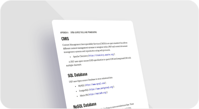 Appendix A Open-SOurce TOOlS And FrAmewOrkS CMIS Content Management Interoperability Services (CMIS) is an open standard that allows different content management systems to integrate with a DXP and control document management systems and repositories using web protocols. • Apache Chemistry (https://chemistry.apache.org/) A DXP uses open-source CMIS specification to query CMS and integrated CMS with multiple channels. SQL Database DXP uses Open source Database to store relational data. • MySQL (https://www.mysql.com/) • PostgreSQL (https://www.postgresql.org/) • Maria DB (https://mariadb.org/) NoSQL Database A DXP uses an open-source NoSQL database to store nonrelational data. These databases have capabilities to push JSON to one’s application in real-time. • MongoDB (https://www.mongodb.com/) • Redis (https://redis.io/) • CouchDB (http://couchdb.apache.org/) • Cassandra (http://cassandra.apache.org/) • RethinkDB (https://www.rethinkdb.com/) 326
