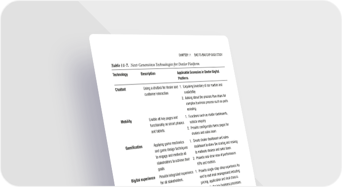 Chapter 11 end to end dXp Case study Table 11-7. Next-Generation Technologies for Dealer Platform Technology Description Applicable Scenarios in Dealer Digital Platform Chatbot using a chatbot for dealer and 1. enquiring inventory of car models and customer interaction availability 2. asking about the process flow steps for complex business process such as parts ordering Mobility enable all key pages and 1. Functions such as dealer dashboards, functionality on smart phones vehicle enquiry and tablets. 2. provide configurable home pages for dealers and sales team Gamification applying game mechanics 1. Create dealer dashboard and sales and game design techniques dashboard to show the scoring and ranking to engage and motivate all to motivate dealers and sales team. stakeholders to achieve their 2. provide real-time view of performance goals KpIs and metrics. Digital experience provide integrated experience 1. provide single-stop-shop experience for for all stakeholders. end to end deal management including pricing, application and deal closure. 2. automate the key business processes. Predictive analytics analytics for improving 1. use predictive analytics to proactively customer experience by forecast parts inventory based on sales. identifying improvement 2. analyze the sLas of the vehicle service opportunities at every process and warranty/claims process and touchpoint in the sales and identify the key bottleneck areas. service life cycle Automated seamless and streamlined 1. provide dealer dashboard providing leads, integrated systems integrated data from various warranty, customer satisfaction score. and dashboards business functions such as 2. provide sales dashboard showing the parts ordering, servicing, region-wise sales and charts for the warranty same. (continued) 319