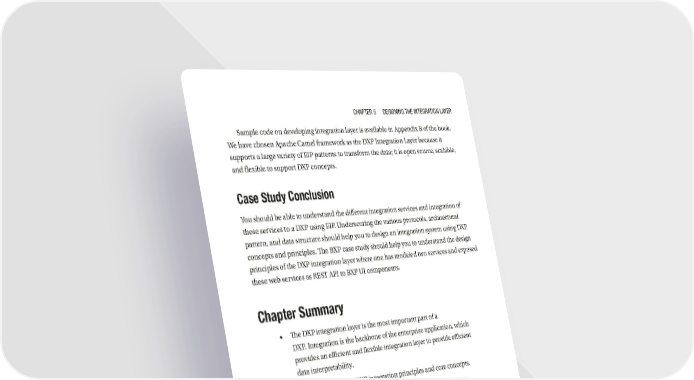 Chapter 5 Designing the integration Layer Sample code on developing integration layer is available in Appendix B of the book. We have chosen Apache Camel framework as the DXP Integration Layer because it supports a large variety of EIP patterns to transform the data; it is open source, scalable, and flexible to support DXP concepts. Case Study Conclusion You should be able to understand the different integration services and integration of these services to a DXP using EIP. Underscoring the various protocols, architectural pattern, and data structure should help you to design an integration system using DXP concepts and principles. The BXP case study should help you to understand the design principles of the DXP integration layer where one has modeled two services and exposed these web services as REST API to BXP UI components. Chapter Summary • The DXP integration layer is the most important part of a DXP. Integration is the backbone of the enterprise application, which provides an efficient and flexible integration layer to provide efficient data interpretability. • You understand the DXP integration principles and core concepts. • You will be able to analyze business requirements to develop an integration layer as per DXP core concepts. 179